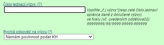 Nově je tedy nutno skutečnost, že plátci povinnost podat kontrolní hlášení nevznikla, správci daně sdělit přes formulář kontrolního hlášení, tzv. formou rychlé odpovědi. Při podání kontrolního hlášení plátce uvede číslo jednací výzvy v předepsané struktuře a zaklikne text "Nemám povinnost podat KH".
