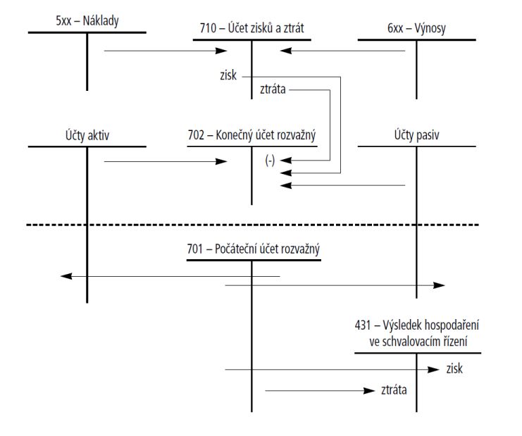 převod zůstatků rozvahových účtů na účet 702 – Konečný účet rozvažný.